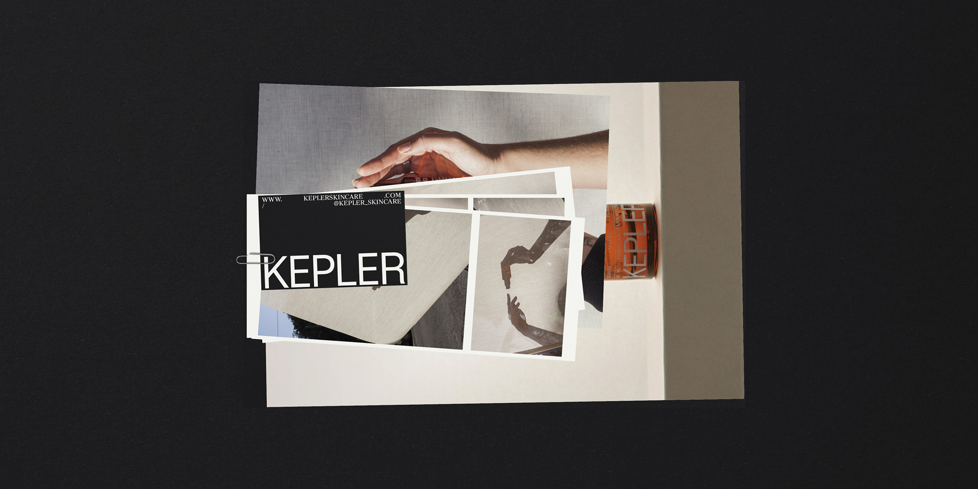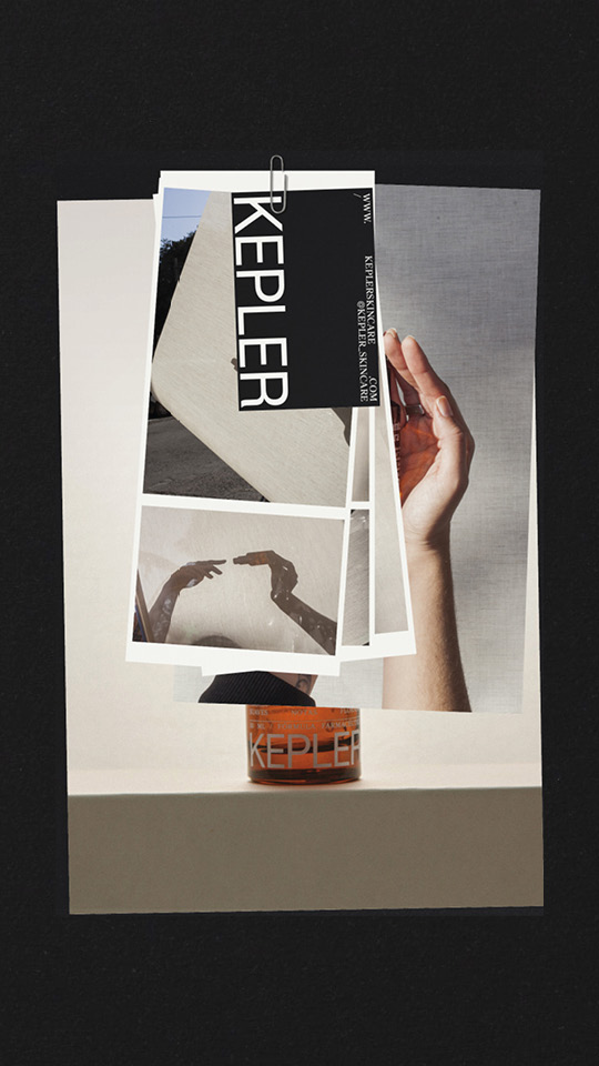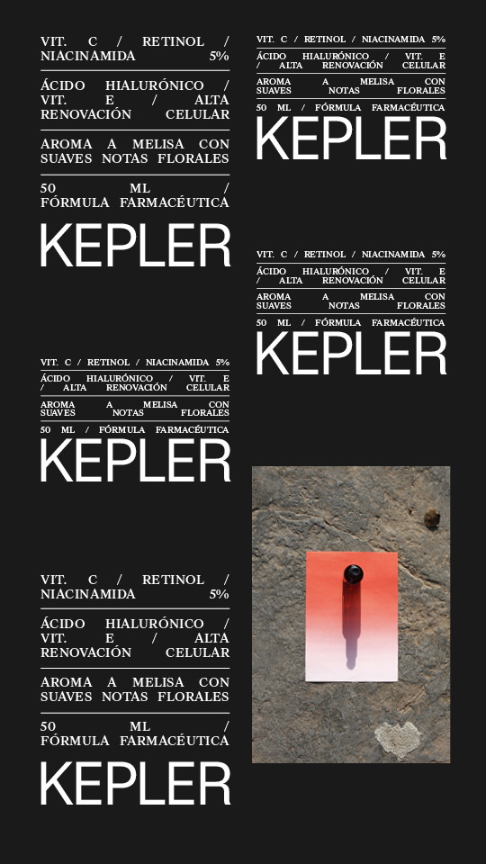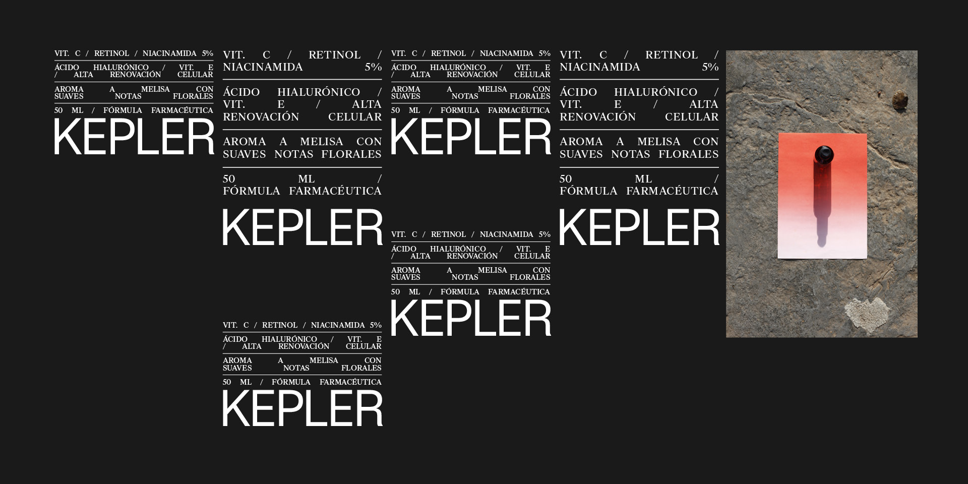 Es desenrotlla l'univers Kepler, des del brànding fins a l'embalatge, sota unes premisses de minimalisme i enfocament nòrdic però alhora sense perdre l'esperit tradicional de la tenda. La paleta és en blanc i negre combinada amb el color ambre del propi flascó interior de la crema que et retrotrau a una altra època.